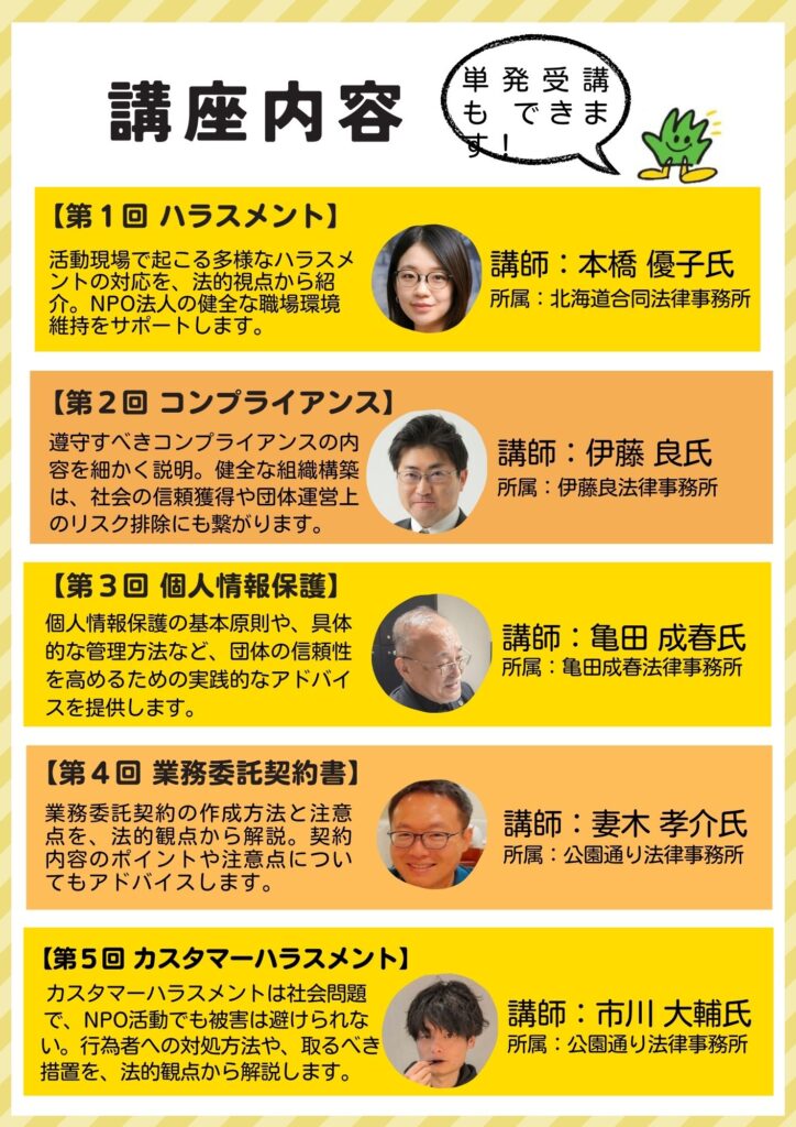 - 対象:NPO法人の運営者・監事、総務・法務担当スタッフ、ボランティア、NPO支援に関わる方